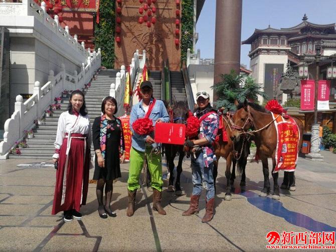 西安市大唐西市絲路風(fēng)情街項(xiàng)目部總監(jiān)上官小榮(左二)給馬背兄弟頒發(fā)《通關(guān)文牒》。