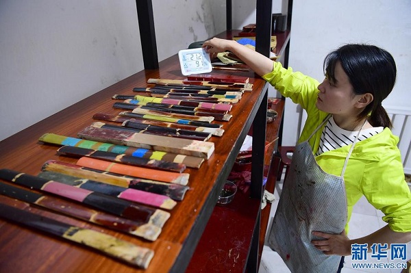 6月15日,袁端姣在車間內(nèi)用調(diào)制好的色漆進(jìn)行打樣。(新華社記者 邵瑞 攝)