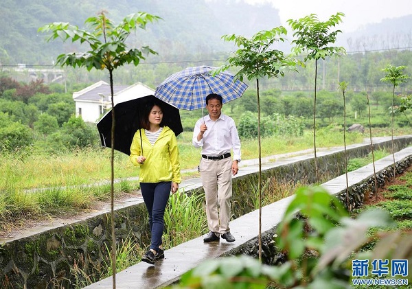 袁端姣(左)與父親袁輝志在龍頭村里查看漆樹苗(6月14日攝)(新華社記者 邵瑞 攝)