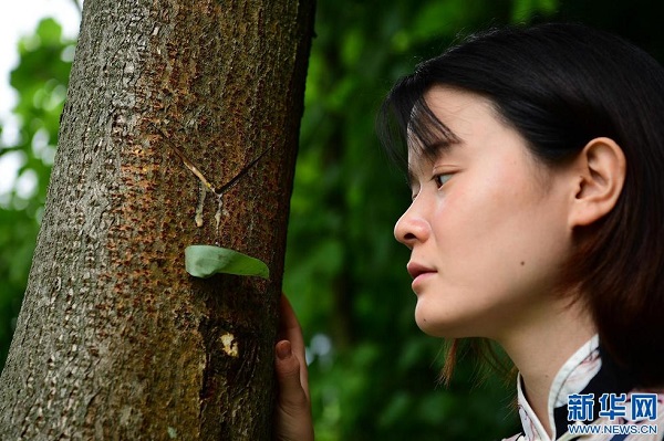 6月15日,袁端姣在公司承包的漆樹林里查看一棵漆樹上的開口。(新華社記者 邵瑞 攝)