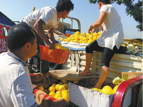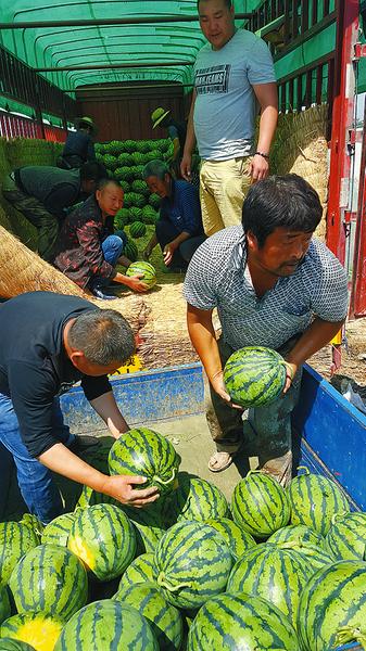 穿過熱鬧的市場,記者鉆進(jìn)埝城村一家正在售賣的西瓜地里,前面三位婦女負(fù)責(zé)采摘成熟的西瓜,后面則由一支來自龍陽鎮(zhèn)的專業(yè)“裝瓜隊(duì)”負(fù)責(zé)裝車?!把b瓜隊(duì)”的六七個(gè)人自成一列,每兩個(gè)人之間保持著一定的距離,待他們站定,只見一顆顆飽滿的大西瓜從最遠(yuǎn)一人的手中拋出,像傳球一樣在空中“飛躍”,經(jīng)幾個(gè)人的接力,最后穩(wěn)穩(wěn)地落到三輪車上的“裝車手”手中。一聲接一聲的吆喝聲彌漫在瓜棚,場面刺激又情趣盎然。每隔20分鐘,滿滿的一車裝載著喜悅與甜蜜的西瓜就運(yùn)到了來自江蘇的大貨車前,驗(yàn)貨、稱重、點(diǎn)鈔票,忙碌的瓜農(nóng)笑意盈盈……