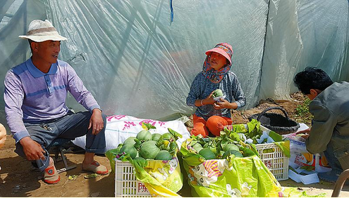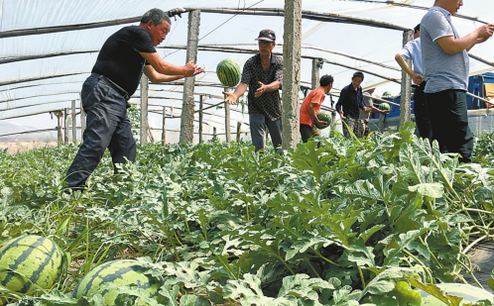 5月25日正午,驕陽乍現(xiàn),渭北大地在熱浪中步入了一年一度的夏收季。蒲城縣龍池鎮(zhèn)的瓜農(nóng)們急著鉆進(jìn)大棚里采摘成熟的西瓜和甜瓜,忙碌地裝著車,往市場上送貨,雖然又累又熱卻樂地合不攏嘴。他們逢人就講:今年產(chǎn)量高,價(jià)又好,這回咱可逮住了!
