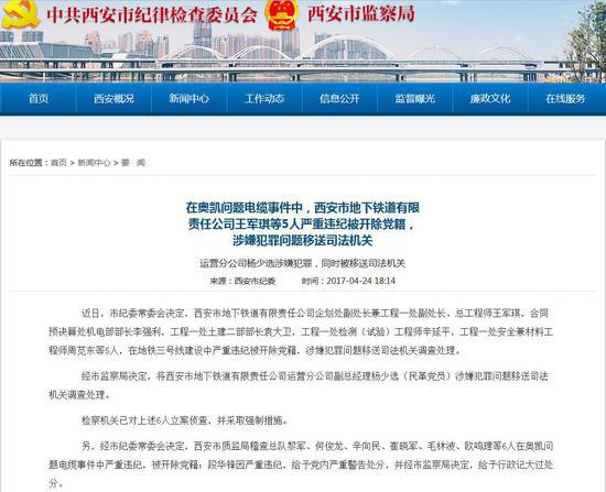 原標題:在奧凱問題電纜事件中,西安市地下鐵道有限責任公司王軍琪等5人嚴重違紀被開除黨籍,涉嫌犯罪問題移送司法機關,運營分公司楊少選涉嫌犯罪,同時被移送司法機關