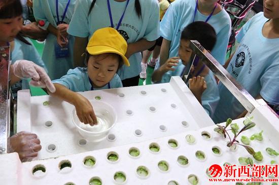 孩子們?cè)趯I(yè)人士的指導(dǎo)下動(dòng)手種植無土蔬菜