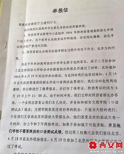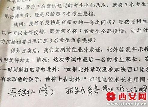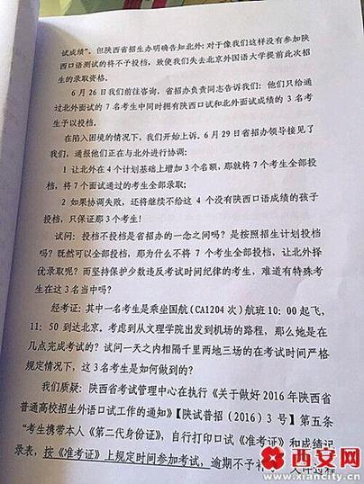 小郭的家長很疑惑“我想請問,不管是北外也好,陜西省招辦也好,你們把考試放在了同一天,一個在北京,一個在西安,你讓我們家長如何選擇?如何選擇才是對的?!我們實在是走投無路,那三個學(xué)生是通過什么方法得到的成績的”在得知無法投檔后,小郭的家人奔波數(shù)日,在省招辦、教育廳、信訪辦和學(xué)校之間徘徊,結(jié)果就是沒有結(jié)果。