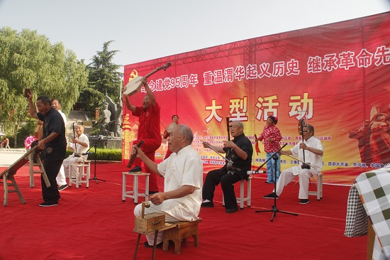 華州皮影文化園的老藝人們現(xiàn)場表演華州老腔《渭華起義英雄漢》
