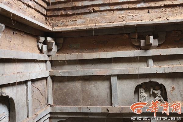 其中,北面墻中間有一處龕室,龕室有高浮雕圖像,圖像清晰可見(jiàn)。東面墻有龕室兩處,一處有磚刻高浮雕圖像,人物圖像勾勒細(xì)膩逼真,由于遭到破壞,無(wú)法看清人物著裝,另外一處無(wú)浮雕,可能遭到破壞。西面墻同東面墻布局一樣,有龕室兩處,均有高浮雕圖像。南邊的圖像已造到破壞,無(wú)法辨別,北邊的浮雕圖像完整,清晰可見(jiàn)。這些圖像都是“二十四孝”故事。