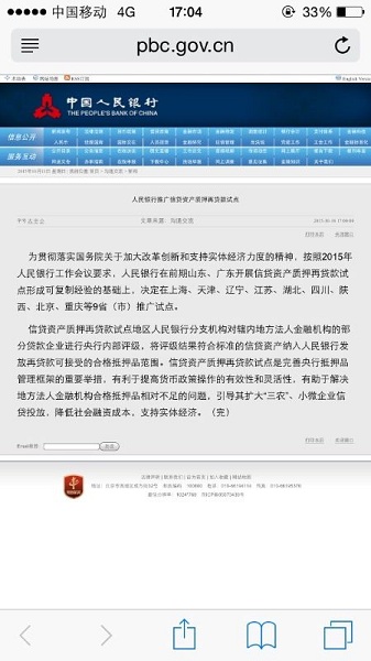 10月11日,華商報記者了解到,為貫徹落實國務院關于加大改革創(chuàng)新和支持實體經(jīng)濟力度的精神,按照2015年人民銀行工作會議要求,人民銀行在前期山東、廣東開展信貸資產(chǎn)質(zhì)押再貸款試點形成可復制經(jīng)驗的基礎上,決定在上海、天津、遼寧、江蘇、湖北、四川、陜西、北京、重慶等9省(市)推廣試點。