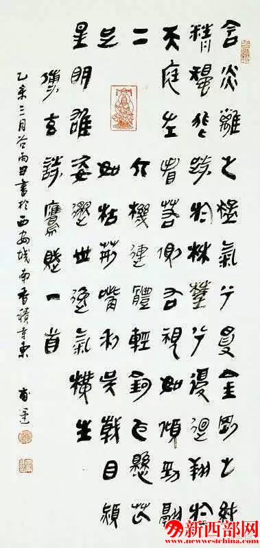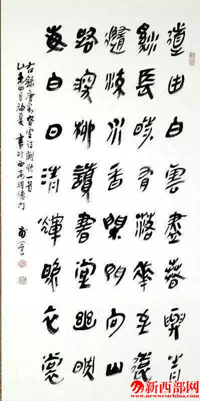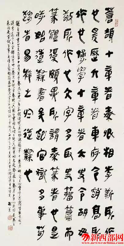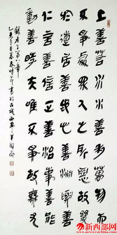 李教授一邊大量研究考古發(fā)掘出的秦隸資料,一邊臨習(xí)之,從青川木牘至里耶木牘,以解決秦文化在書法藝術(shù)中的表現(xiàn)方法及風(fēng)格,并最終形成一種獨具風(fēng)采的秦隸書法藝術(shù),有“華夏秦隸第一人”之譽。先生作品深受國人厚愛,兩岸四地所見頗多。其作品不僅被黨和國家領(lǐng)導(dǎo)人收藏,還被世界文化名人如日本的池田大作、馬來西亞的繼程法師收藏。