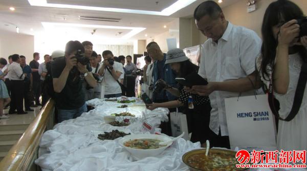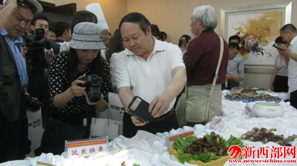 2015年5月23日,橫山縣在西安舉行羊肉品牌推介會(huì),橫山縣委書記王效力(前右一)同記者一起拍攝羊肉熟食品。新西部網(wǎng) 王順利攝