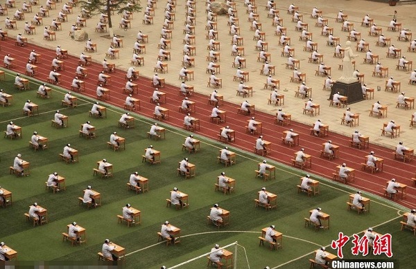 據(jù)悉,千余名考生坐在室外考試,每名考生間隔2米,考桌反方向擺放,考場(chǎng)中任何和考試無(wú)關(guān)的東西都不允許帶入,筆由學(xué)校統(tǒng)一發(fā)放,考試現(xiàn)場(chǎng)無(wú)監(jiān)考教師,學(xué)院監(jiān)控室中留一名監(jiān)考教師。圖為室外考試現(xiàn)場(chǎng)。