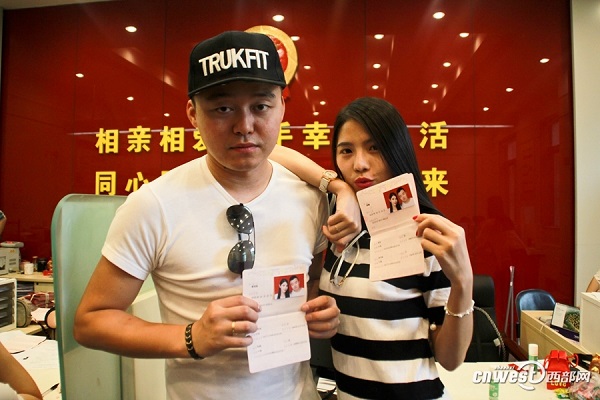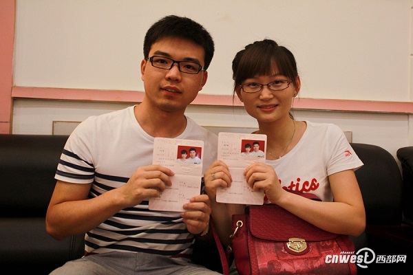 這對一直到下午4點還在排隊等候的新人是劉聰和胡琴芳,他們因為心情太激動,結果上午跑錯了地方,一直到下午才來到雁塔區(qū)婚姻登記處,前面還有30多對,他們打算一直等著。