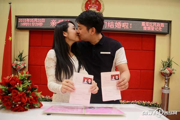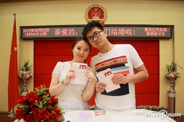 今天是2015年5月20日,也是諧音的“我愛你”,所以許多新人選擇在今天領取結婚證。