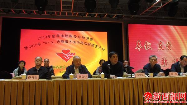 陜西省慈善協(xié)會2014年慈善志愿服務(wù)總結(jié)表彰暨2015年“3.5”志愿服務(wù)活動周動員部署大會今天在西安召開,劉維隆會長(右三)發(fā)表講話。新西部網(wǎng) 王順利攝