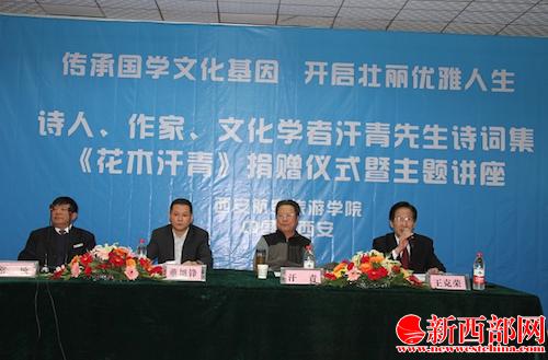 新西部網(wǎng)訊(記者宋海龍)2014年11月12日,在西安航空旅游學(xué)院拓展中心會(huì)議室,詩人汗青向西安航空旅游學(xué)院贈(zèng)送新近出版的詩集《花木汗青》并舉辦題為“傳承國學(xué)文化基因,開啟壯麗優(yōu)雅人生”的專題講座。西航院黨委書記、院長董旭鋒、常務(wù)副院長唐永祥、黨委副書記常敏、紀(jì)委書記王克榮以及該院300名師生代表參加了捐贈(zèng)儀式,并聆聽了汗青先生的專題講座。