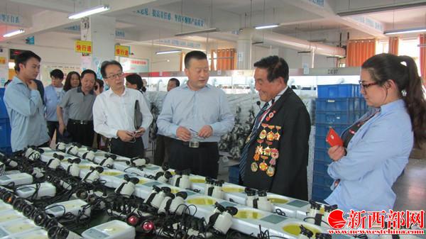 2014年5月20日下午,陜西省食品藥品監(jiān)督管理局局長胡小平(右一)在西安華亞電子有限責任公司調(diào)研,左一系西安華亞電子有限責任公司董事長郭永勝。新西部網(wǎng) 王順利攝