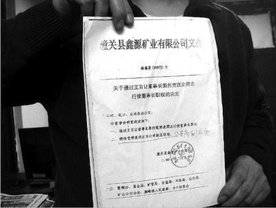 對(duì)于這個(gè)任命,4月17日,潼關(guān)縣鑫源礦業(yè)公司最大的持股人黨西北在接受記者采訪時(shí)表示,黨明亮任命是在特殊情況下頒發(fā)的,而且這個(gè)事情已經(jīng)做過(guò)結(jié)論了,現(xiàn)在黨明亮沒(méi)有在鑫源公司擔(dān)任任何職務(wù)。既然有任命文件,就有免職的文件和通知,黨西北沒(méi)有向記者提供,但有知情者證實(shí)黨明亮并沒(méi)有辭去該公司“副總經(jīng)理”職務(wù)。