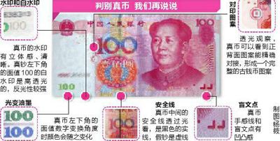 經(jīng)銀行工作人員驗(yàn)證,這種假幣比真幣稍小一點(diǎn),票面上有一塊塊陰影。真幣折疊后甩一下會(huì)發(fā)出清脆的聲音,而假幣甩一下發(fā)出的是綿綿的聲音。除此之外,還有哪些判別真幣的方法,我們?cè)賮?lái)說(shuō)說(shuō)。