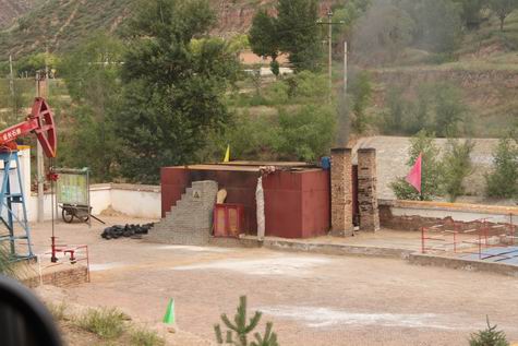 采訪團經(jīng)指引參觀延長石油靖邊采油廠一處示范井場,可以看到現(xiàn)場放置方形儲油罐,油罐頂部配有黑色油管。而記者沿公路觀察發(fā)現(xiàn),幾處油井場緊靠油罐用磚壘有排煙筒,油罐一側(cè)底部和罐體留有燃煤煙痕跡。據(jù)工作人員介紹,該廠油井多用燃煤明火將原油就地加溫脫水,脫水后的原油用汽車運輸,后來有的井場改用電熱加溫原油。在靖邊縣河流沿岸,有的油井場地正在加工原油,煙筒冒出濃煙。