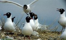 遺鷗,學(xué)名Larusrelictus,現(xiàn)其繁殖地集中在蒙古國、哈薩克斯坦、俄羅斯和中國,其越冬地在中國和韓國亦有發(fā)現(xiàn)。遺鷗棲息于海拔1200—1500米的沙漠咸水湖和堿水湖中,繁殖期在5月初至7月初,雜食性,繁殖期以水生昆蟲等動物性食物為主。遺鷗為世界瀕危物種,近年在內(nèi)蒙古鄂爾多斯發(fā)現(xiàn)比較穩(wěn)定的繁殖種群,為世界已知最大的群體之一。遺鷗繁殖地只有中亞哈薩克斯坦的阿拉庫爾湖、俄羅斯的外貝加爾湖、蒙古和中國內(nèi)蒙古地區(qū)等少數(shù)幾個荒漠與半荒漠湖泊地帶,2000年,總數(shù)量約1萬只。2000年10月,在陜西省神木縣紅堿淖首次發(fā)現(xiàn)國家一級重點保護野生動物遺鷗以來,引起了國家有關(guān)部門和省、市、縣人民政府的高度關(guān)注,隨著保護力度的加強,2005年紅堿淖的遺鷗種群已超萬只,成為全球最大的遺鷗繁殖種群。