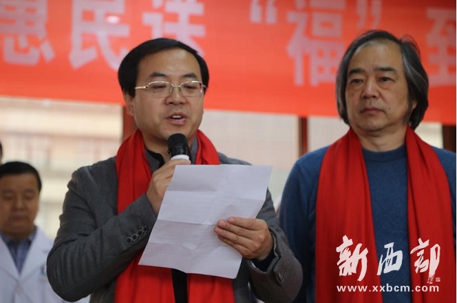 寶雞市第二中醫(yī)醫(yī)院院長岳衛(wèi)東在致辭中對前來義務書寫春聯(lián)的各位書法家表示歡迎和感謝。他表示:“中華文化博大精深,中華民族的審美觀念、價值取向,同樣體現(xiàn)在具有深邃中國傳統(tǒng)文化的書法筆墨當中,歷久彌新,源遠流長。此次西安市“一帶一路”書法院文化惠民送“?!钡交鶎踊顒樱瑢閷氹u市第二中醫(yī)醫(yī)院全體醫(yī)護人員和廣大患者營造濃厚的年味,也為醫(yī)院帶來了濃郁的中國傳統(tǒng)文化藝術(shù)氛圍,是對我們工作業(yè)績的肯定與鼓勵。”