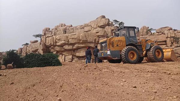 坊叔通過收費站右側(cè)的小道走近假山,這座大景觀正在改造,原本的水景觀被改成了草坪,挖掘機、灑水車大卡車都停在施工地點,工人們正在忙著栽種各類綠化樹木。