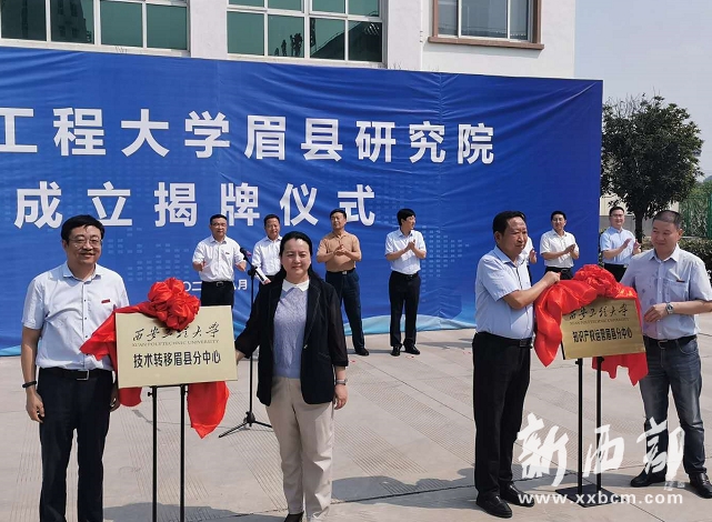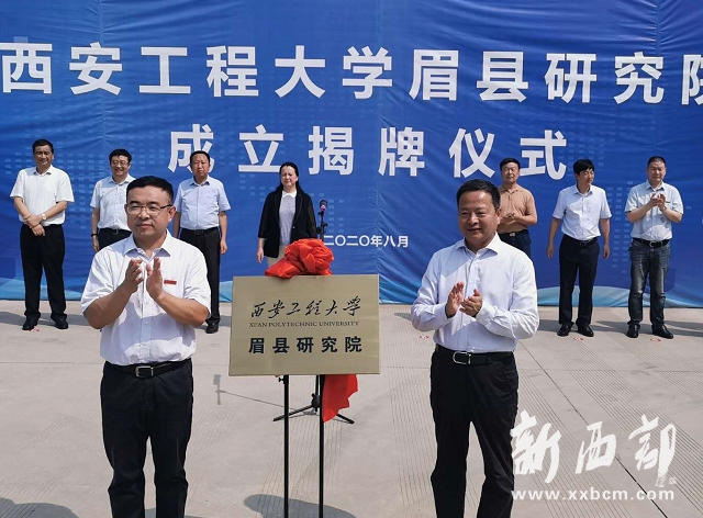 寶雞市委常委、宣傳部部長武勇超、西安工程大學校長高嶺共同為“西安工程大學眉縣研究院”揭牌;