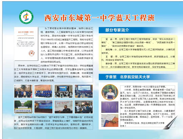 為貫徹落實高中新課改精神,培養(yǎng)新工科領(lǐng)域新時代人才,東城一中與空軍工程大學(xué)合作,成立藍(lán)天工程班。兩年來,兩校聯(lián)合開展了豐富多彩的特色活動,開拓學(xué)生視野,讓學(xué)生提前感知大學(xué)學(xué)習(xí)生活,為未來專業(yè)發(fā)展和職業(yè)規(guī)劃奠定基礎(chǔ)。