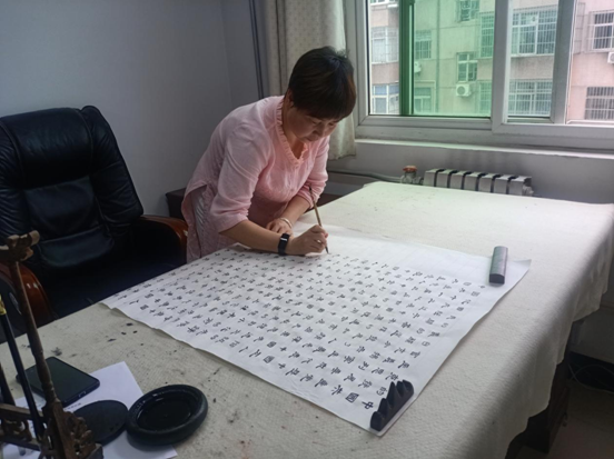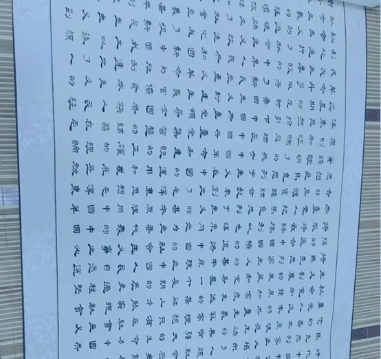 在趙曉晴的家中,記者見到了這幅作品。打開卷軸,毛筆字工整、清秀,令人賞心悅目??v行21個字,橫行344字,共計7224個字,字字隸書,蠶頭燕尾,一波三折,筆力遒勁,疏密有致,一撇一捺間都凝聚著一位黨員干部對黨的感恩,對祖國的熱愛!