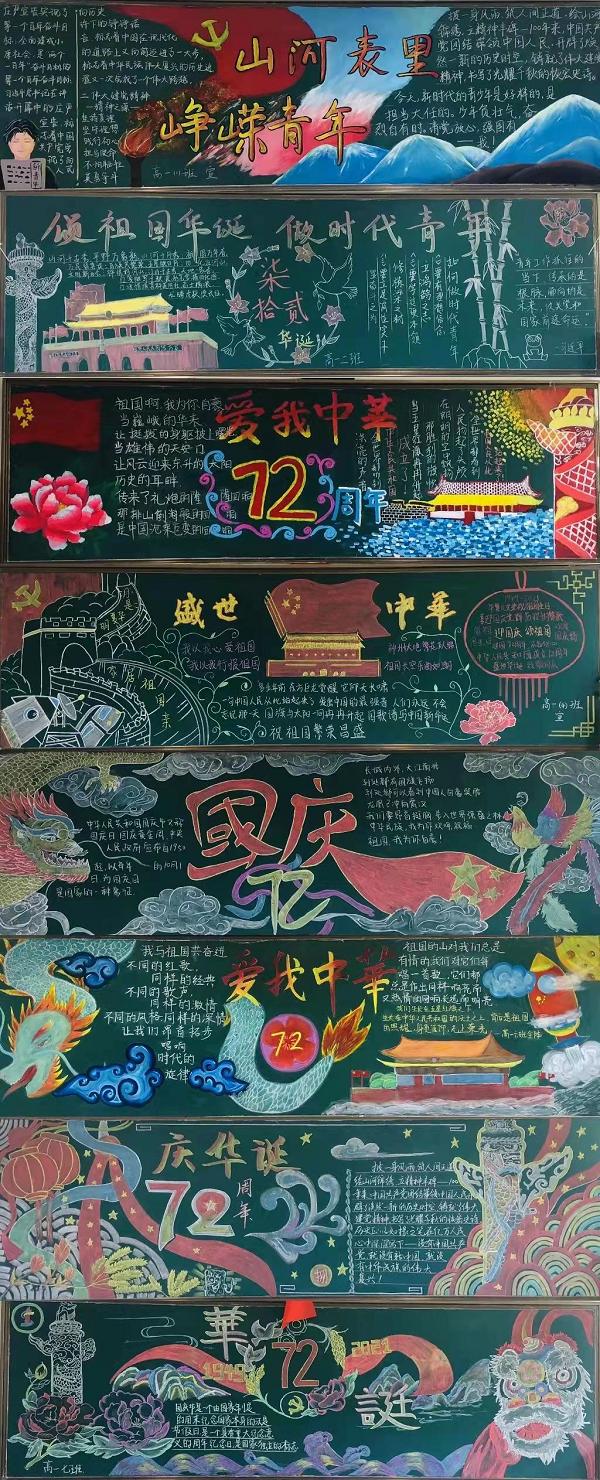 經(jīng)過(guò)兩周時(shí)間的精心布置,各個(gè)年級(jí)的同學(xué)們?cè)诶蠋煹闹笇?dǎo)下,自己搜集資料、設(shè)計(jì)排版、調(diào)整美化,用別出心裁的創(chuàng)意與稚嫩工整的字跡完成了一幅幅畫面精美、文字深情的專題黑板報(bào),表達(dá)對(duì)祖國(guó)母親的尊敬和熱愛。