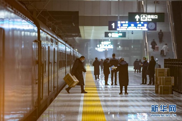 2021年12月31日,西安火車站改擴建工程完成投用,T7次列車??课靼不疖囌具M行行李裝卸。劉翔 攝