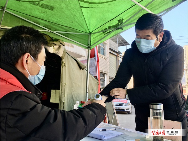 1月1日中午,金臺區(qū)金河鎮(zhèn)岳家坡村防疫檢查點上,一名50多歲的中年男子指引一輛要進村的小車進行檢測登記。這名男子叫岳東生,是1984年退伍的一名老兵,也是村上的一名防疫志愿者。