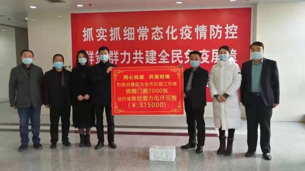 在捐贈儀式上,寶雞高新區(qū)釣魚臺景區(qū)向寶雞市疫情防控工作指揮部和市文旅局捐贈景區(qū)門票5000張,向寶雞高新區(qū)疫情防控工作指揮部捐贈景區(qū)門票2000張,總計7000張,總價值315000元。