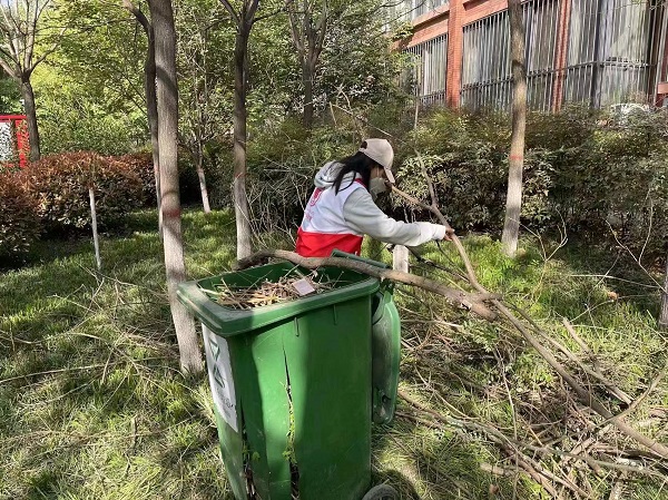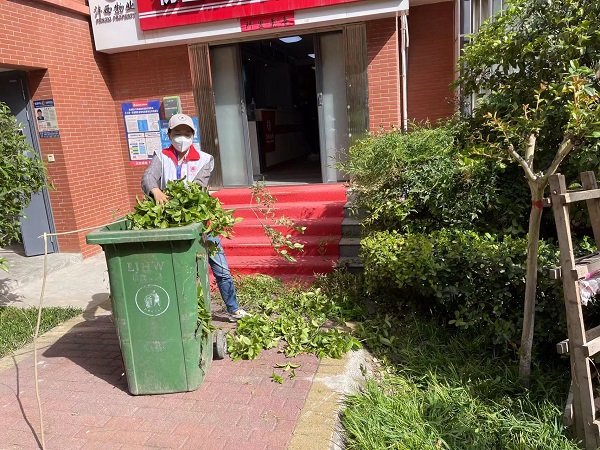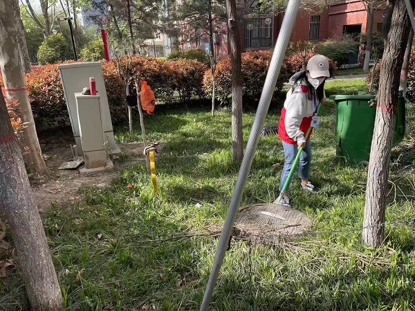 4月26日下午,走訪后的小李意識到小區(qū)安全隱患排查和綠化修整刻不容緩。她與小區(qū)物業(yè)溝通協(xié)調(diào)后,第一時間與園林維護工作人員一起拿著油鋸、繩子、樓梯等工具到現(xiàn)場。他們穿梭在綠化帶中,將遮擋住戶采光的、與電力設(shè)備距離過近有安全隱患的枝葉進行全方位修剪。住戶窗外小李紅色的身影不斷忙碌著,她時而伏腰撿樹枝、清掃樓宇墻角的垃圾、清理灌木叢中的落葉,時而趴在地上用手清理灌木角落工具不便觸及的垃圾。一番努力過后,看著陽光撒進居民家中,他們滿意地笑了。