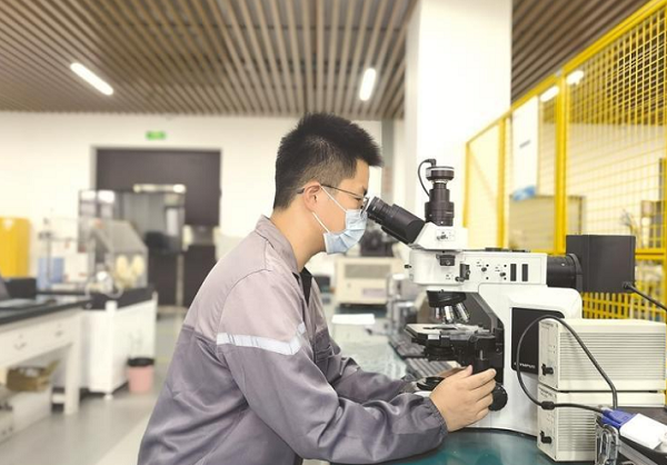 8月4日,武通海團(tuán)隊(duì)的科研人員正在觀察鐵譜譜片。記者郭詩(shī)夢(mèng)攝