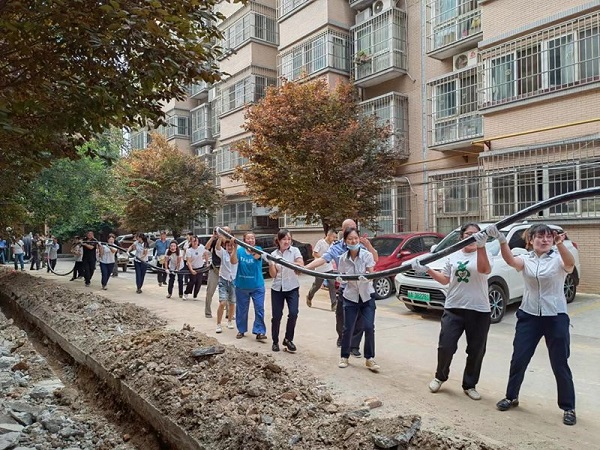 在電纜更換施工中,冒著40°高溫,社區(qū)黨組織書記楊長喜、小區(qū)黨支部成員、物業(yè)黨員帶領(lǐng)工作人員挖溝、下電纜。看到工作人員的辛苦,社區(qū)不少居民也參與進(jìn)來。拉電纜、喊口號,大家干勁十足。