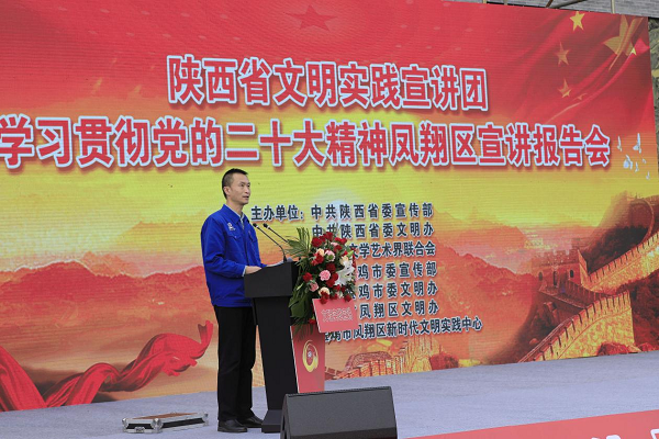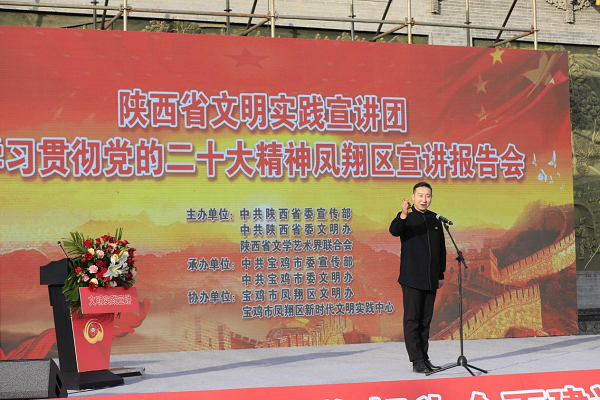 11月15日,由省委宣傳部、省委文明辦、省文聯(lián)組織的陜西省“文明實踐宣講團”走進鳳翔區(qū)城關(guān)鎮(zhèn)六營村。在六營村新時代文明實踐廣場,9名宣講團成員緊緊圍繞學(xué)習(xí)貫徹黨的二十大精神主題,把理論知識轉(zhuǎn)化成百姓話語,將“大理論”和“小故事”相結(jié)合,有新時代新征程創(chuàng)造新輝煌的理論宣講,有黨的二十大代表的精心分享,有干貨滿滿的惠民政策解讀,還有抑揚頓挫的朗誦、歡歌笑語的相聲、朗朗上口的快板等。