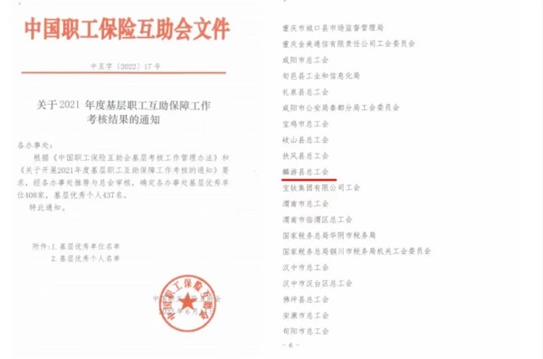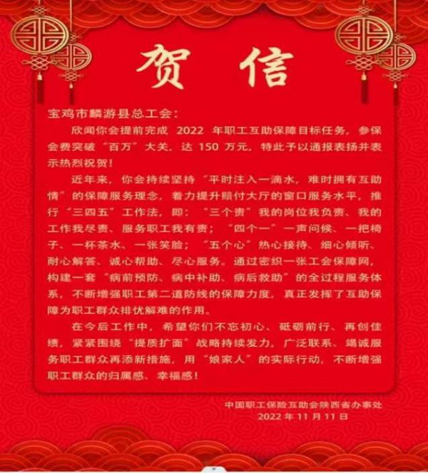 職工互助保障工作再創(chuàng)佳績(jī)。全縣147家單位參保,覆蓋職工8863人,參保人次19045次,收取互助保險(xiǎn)156.1萬(wàn)元,榮獲“全國(guó)職工互助保障工作先進(jìn)集體”。陜西省總工會(huì)互助保障工作代辦處、寶雞市總工會(huì)互助保障工作代辦點(diǎn)分別發(fā)來(lái)賀信。
