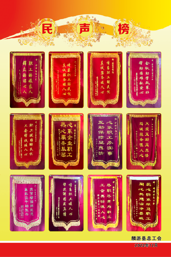 群眾贊譽(yù)聲更高。隨著工會(huì)服務(wù)職工水平的不斷提升,受到廣大職工群眾的一致好評(píng)。2022年,麟游縣運(yùn)輸公司工會(huì)、麟游縣九成旅游服務(wù)有限公司工會(huì)、麟游中學(xué)工會(huì)、九成宮良舍村工會(huì)、麟游九成賓館有限責(zé)任公司職工李麗萍、兩亭鎮(zhèn)政府職工宛建國(guó)、廟灣獸醫(yī)站職工張乃鵬等組織和個(gè)人向縣總工會(huì)贈(zèng)送錦旗12面,發(fā)來(lái)感謝信1份。