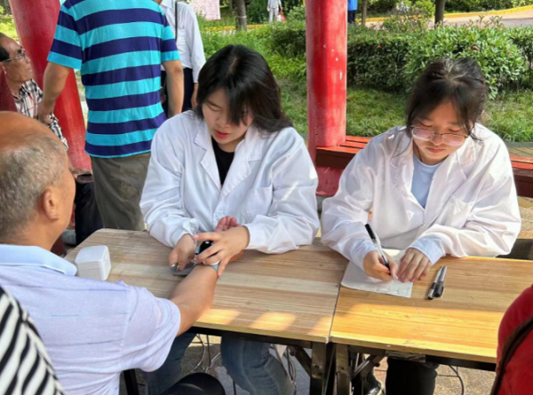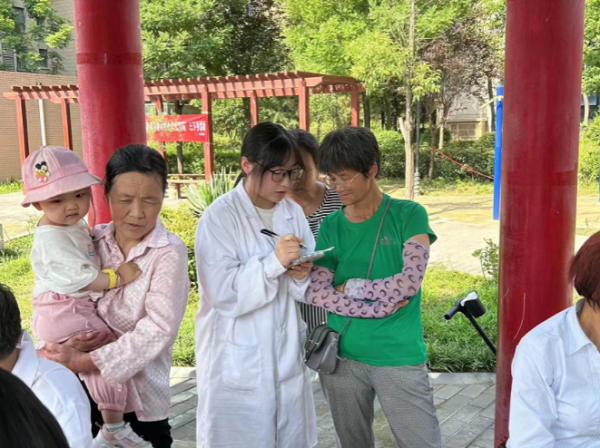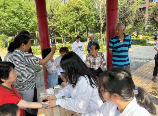 活動現(xiàn)場,學(xué)生們與社區(qū)居民全面互動交流。一方面,為社區(qū)居民義務(wù)量血壓,咨詢居民身體健康狀況,并將自己在學(xué)校所學(xué)的專業(yè)得以實踐應(yīng)用,現(xiàn)場為社區(qū)居民進(jìn)行健康知識宣講,把全科服務(wù)送進(jìn)基層;另一方面,學(xué)生們認(rèn)真調(diào)研記錄,了解居民生活幸福度等情況,以致更好地做好實踐服務(wù)。