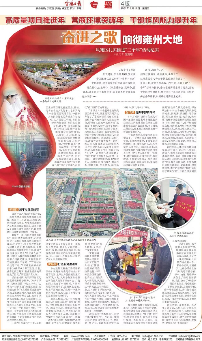 回望2023年,鳳翔區(qū)收獲滿滿,成績斐然,全區(qū)上下以堅定的信心和大干快上的勁頭交出了一份有分量、有底氣的答卷。2023年,鳳翔區(qū)以“三個年”活動為抓手,全力推進(jìn)高質(zhì)量項目發(fā)展、突破營商環(huán)境中的堵點(diǎn)、提升全區(qū)干部作風(fēng)能力,以實干拼出全年精彩,以實績推進(jìn)高質(zhì)量發(fā)展。