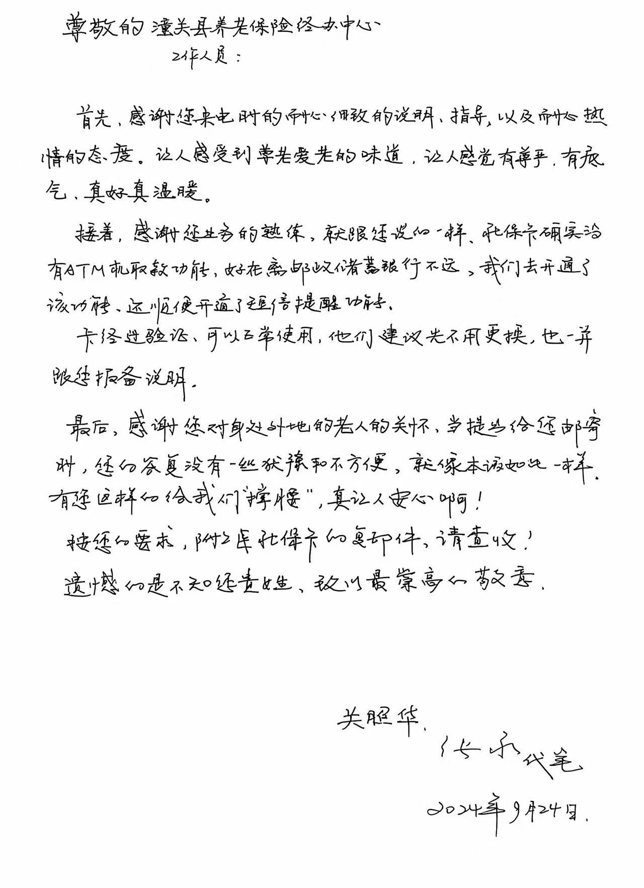 關(guān)女士在信中深情地寫道:“感謝您來電時的耐心細致的說明、指導(dǎo),以及耐心熱情的態(tài)度,讓人感受到尊老愛老的味道,讓人感覺到有尊嚴、有底氣,真好真溫暖?!?/p>