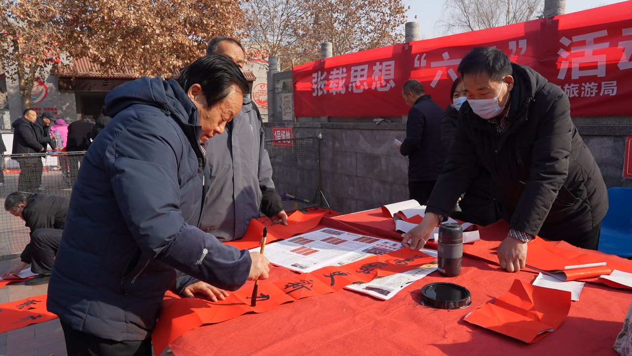 活動現(xiàn)場,講解員為現(xiàn)場的群眾講解張載“六進”思想,多名書法愛好者揮毫潑墨,或龍飛鳳舞、瀟灑飄逸,或結(jié)體遒勁、渾厚圓潤,一副副散發(fā)著清新墨香的喜慶春聯(lián)躍然于紙上,火紅的春聯(lián)寄托著辭舊迎新、接祥納福的美好祝愿。現(xiàn)場群眾們忙著選對子、晾春聯(lián),各個興高采烈,感受著滿滿的年味與祝福。