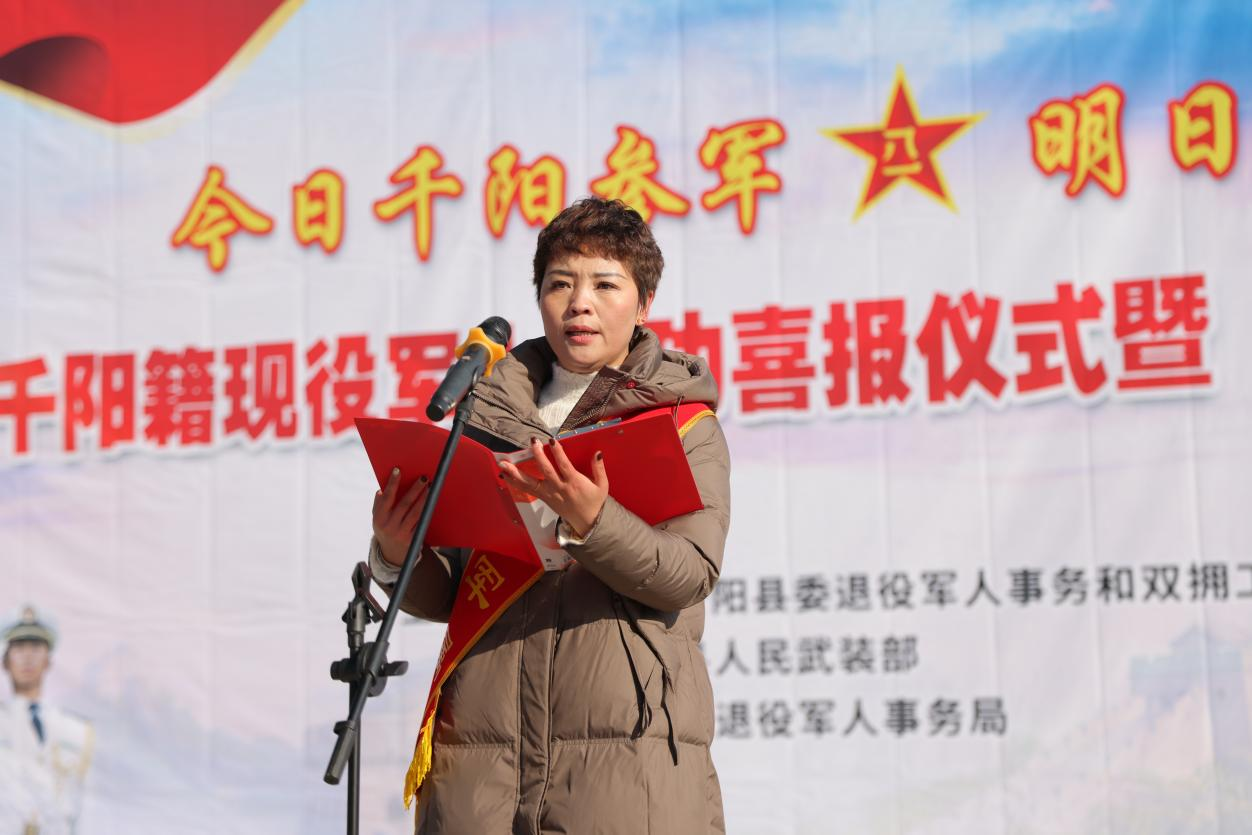 縣委常委、統(tǒng)戰(zhàn)部部長(zhǎng)趙選民代表縣委、縣政府進(jìn)行了致辭,他向所有立功受獎(jiǎng)軍人及家屬表示熱烈的祝賀,感謝他們?yōu)閲?guó)防事業(yè)做出的貢獻(xiàn),并希望全縣上下要大力弘揚(yáng)正能量,唱響主旋律,讓獻(xiàn)身國(guó)防、建功軍營(yíng)成為全縣青年的最美追求。全縣現(xiàn)役軍人家屬要鼓勵(lì)服役戰(zhàn)士安心軍營(yíng),積極訓(xùn)練,爭(zhēng)創(chuàng)佳績(jī)。廣大千陽(yáng)籍現(xiàn)役軍人堅(jiān)決聽(tīng)黨指揮,忠誠(chéng)履行使命,不負(fù)韶華,踔厲奮發(fā),篤行不怠,用奮斗講好千陽(yáng)故事,用奮斗書(shū)寫(xiě)不悔人生。全縣各級(jí)組織要主動(dòng)了解軍人軍屬所思所盼所需,解決他們的“操心事、揪心事、煩心事”,最大限度為衛(wèi)國(guó)戍邊的官兵解決后顧之憂,讓他們專心軍營(yíng)、建功國(guó)防。