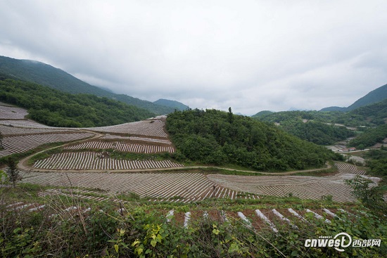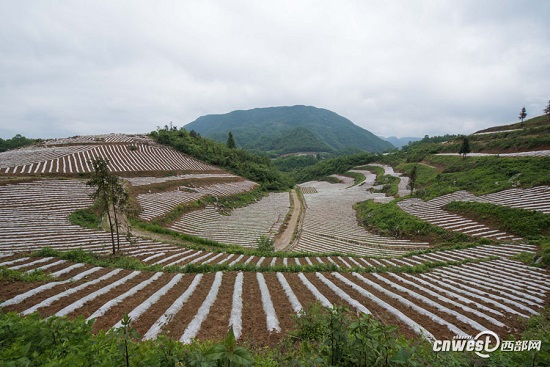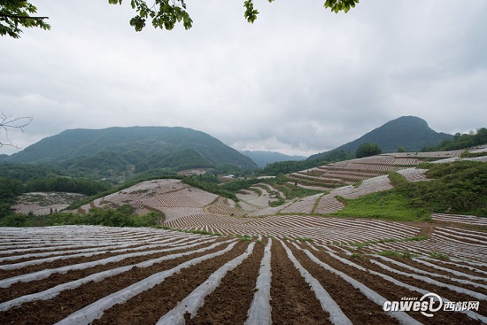 春夏之交,大巴山的坡地上種上了地膜烤煙,站在山脊高處放眼望去,一面面山坡上都是剛剛播種完的烤煙,新覆的薄膜反射著一道道銀色的亮光,就像一層一層波浪在山野間涌動,如同“上帝的指紋”。
