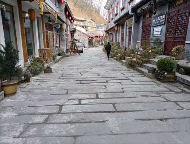 我想,留壩街市古而有之,據(jù)史料記,夏商即有居民,可能也是古棧道驛站形成的歷史遺存。縣志載元二年(1337)十二月“丙子,命興元府鳳州留壩鎮(zhèn)¨¨¨”,雖設廳只二百多年,但形成街鎮(zhèn)恐在千年以上。今天人們所稱老街,可能形成很早了,在任奎光筑磚城后又逐漸發(fā)展。庚子冬日,我夫婦和友人慕名到老街參觀體味。步行走通后,我估計老街長約千米,道寬四米許,順山根蜿蜒座落。道旁房屋建筑風格薈萃秦風蜀韻,“既四川又關中”,兼容混雜,鱗次櫛比,明椽明柱、青瓦磚脊,石條滿街、商鋪林立,錯落有致、特點各具、燈籠火紅、商市迤邐......