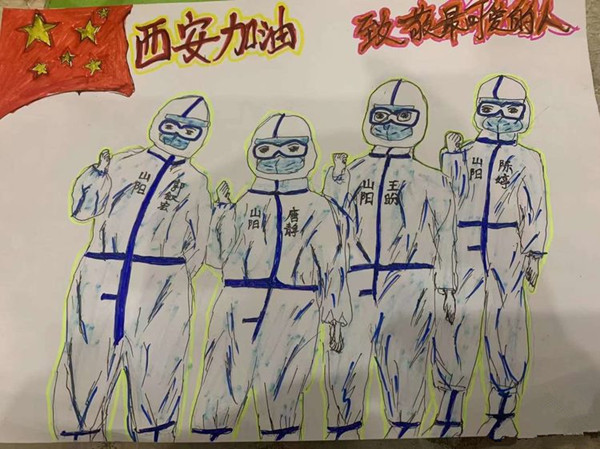 第二天,我們又被分到了金地西灃公元一期二期采樣,這個小區(qū)共有15000多人口,采集任務量特別大,早上臨出門時我叮囑大家,不要喝水,不要喝奶,不要喝粥,免得上廁所浪費防疫物資,大家毫無怨言,趕到目的地立即投入工作,一位三年級的小朋友為我們的隊員送了一副“最美逆行者”的畫,一位70多歲的老爺爺為我們的隊員鞠了一個90°的躬,隊員不知所措,趕緊給老爺爺回了一個90°的鞠躬,并說:不用客氣,這是我們應該做的。各種感動飄然而至。任務完成,在回酒店的車上大家特別興奮,因為我們的工作得到了業(yè)主的認可。曼玉說:唐老師,今天跨年了,咱們拍張照片吧。這時候,大家才意識到,這是2021年的最后一天,跨年了,我們又不約而同地成長了一歲。