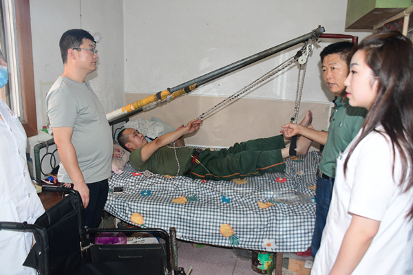 收入上去了,大家又尋思著如何幫賈滿濤提高生活質(zhì)量。2019年5月,中省殘聯(lián)“輔具助殘脫貧項目”在丹鳳啟動,殘聯(lián)工作人員多次在他家現(xiàn)場開“諸葛會”,從衣食住行到生產(chǎn)經(jīng)營,對他的行動軌跡多次現(xiàn)場模擬演示,制定了初步設(shè)計方案。經(jīng)反復(fù)測試,最終殘聯(lián)為他量身定制了一個滿足個性需求的綜合型輔助技術(shù)創(chuàng)新方案:起居杠桿輪滑吊床+移乘出室+如廁洗澡+升降出行?!捌鹁痈軛U輪滑吊床”的創(chuàng)新設(shè)計,使賈滿濤上下床方便省力,解決了他上下床、站得起、走得出的難題,大大提高了他日常生活的質(zhì)量;“移乘出室”利用多功能輪椅方便他移位;“如廁洗澡”改善了他日常基本生活衛(wèi)生護(hù)理狀況;“升降出行”解決了他出入門口障礙。為了避免長時間坐輪椅造成肌肉壞死的危險,賈滿濤在加工臺上設(shè)計了一個固定的鋼筋支撐架,使自己能依靠架子站著工作,不了解的人還以為他是健全人。平日里,他還堅持在床上利用拉桿裝置做引體向上鍛煉,坐在輪椅上舉啞鈴鍛煉臂力。他常說:上帝為我關(guān)上了一扇門,肯定會為我新開一扇窗。這扇窗對我來說,也許更寬廣!