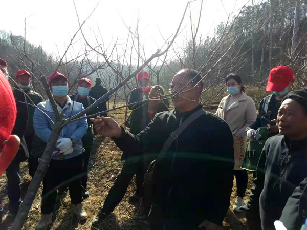 在當(dāng)天的果樹科管培訓(xùn)中,母德軍就三官廟村的自然條件和當(dāng)前商南縣的果業(yè)經(jīng)濟、存在的突出問題等進行了宏觀分析,并結(jié)合村里果樹種植情況,著重就桃樹灌溉施肥、土壤管理、修剪定干、病蟲害防治等方面,進行了深入淺出的講解。針對群眾在果樹生產(chǎn)管理中遇到的各種問題作了耐心、細致的解答。期間,蔡來喜深入田間地頭,就果園土、施肥、澆水,拉枝、疏枝、拿枝等科管技術(shù)及果園病蟲害科學(xué)防控等問題進行面對面解惑,手把手示范指導(dǎo)。