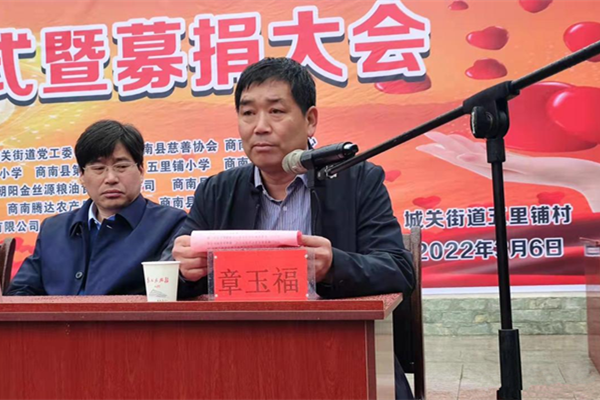 在啟動(dòng)儀式上,城關(guān)街道黨工委書記劉毅進(jìn)行了熱情洋溢地致辭,五里鋪村黨支部書記、村主任章玉福匯報(bào)了前期工作開展情況,原縣政協(xié)副主席、縣社會(huì)各界愛心濟(jì)困協(xié)會(huì)會(huì)長(zhǎng)汪祥來(lái)對(duì)慈善幸福家園募捐進(jìn)行了再動(dòng)員,縣政協(xié)原主席、縣慈善協(xié)會(huì)會(huì)長(zhǎng)王守華做了主旨講話,對(duì)五里鋪村前期工作給予了充分肯定,對(duì)于今后實(shí)施慈善幸福家園建設(shè)提出了明確要求。大會(huì)聘任章功孝、田明林、蔡華憲、張?jiān)慈獮槲謇镤伌宕壬乒ぷ髡久u(yù)會(huì)長(zhǎng),并頒發(fā)了聘任證書;同時(shí)向商洛市廣濟(jì)醫(yī)院、中劍公司、商南縣職教中心、陜西省商南縣宏源食品有限公司、商南縣各界愛心濟(jì)困協(xié)會(huì)、商南縣力卓礦業(yè)有限公司、商南縣楊明礦業(yè)有限公司、商南縣坤發(fā)礦業(yè)有限公司、商南縣福壽老年服務(wù)中心、商南縣農(nóng)業(yè)農(nóng)村局、商南縣醫(yī)院、國(guó)電商南供電公司、商南騰達(dá)農(nóng)產(chǎn)品有限公司、五里鋪村黨支部書記村主任章玉福、商南縣富鑫旺農(nóng)牧有限公司、商洛市朝陽(yáng)金絲源糧油食品有限公司等18家企事業(yè)及個(gè)人頒發(fā)了“慈善就是福,德潤(rùn)五里鋪”愛心紀(jì)念牌和捐贈(zèng)證書。